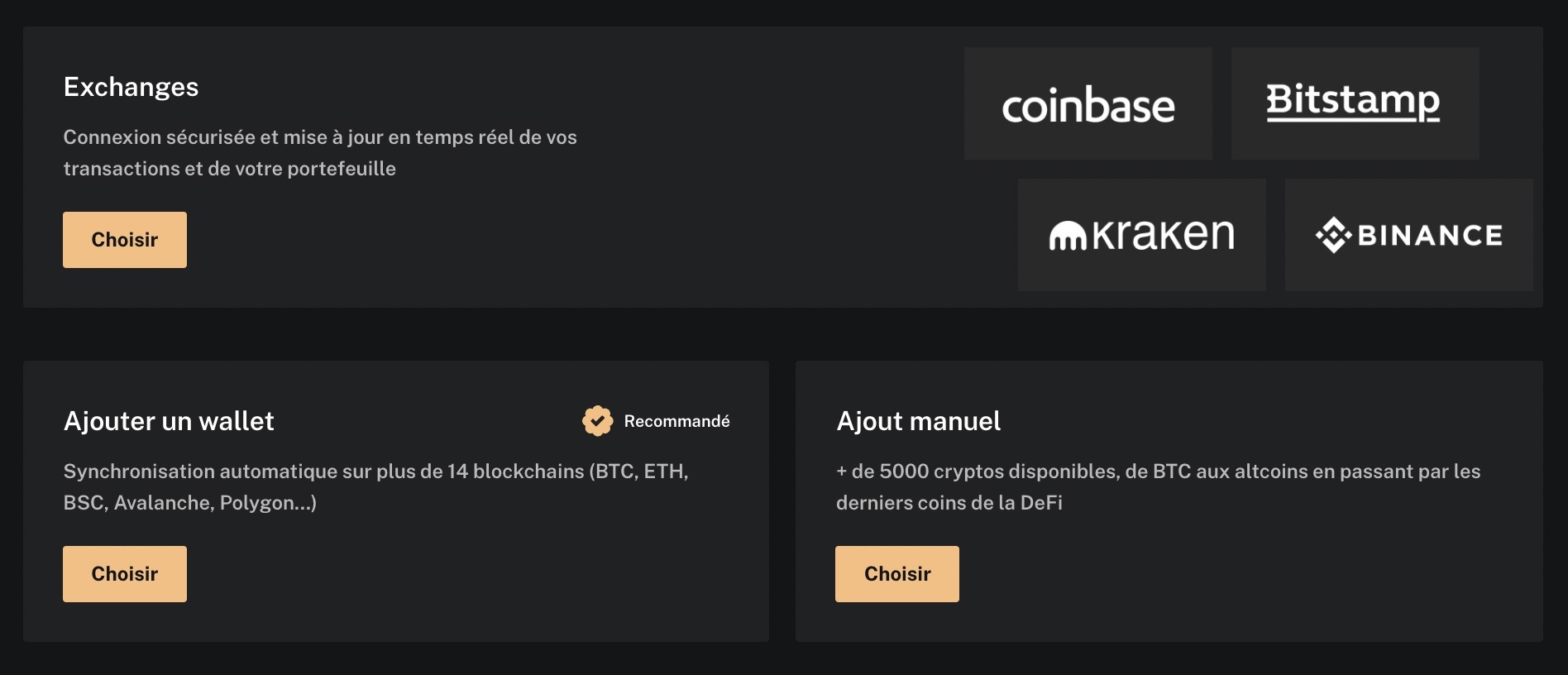Vous allez pouvoir connecter à la fois des exchanges (Binance, Coinbase, Bitpanda, etc) mais également des wallets (comme MetaMask ou Ledger). Cela vous permet donc d’avoir un suivi précis et, pour les exchanges qui le permettent, une estimation de vos plus-values comme Bitpanda.