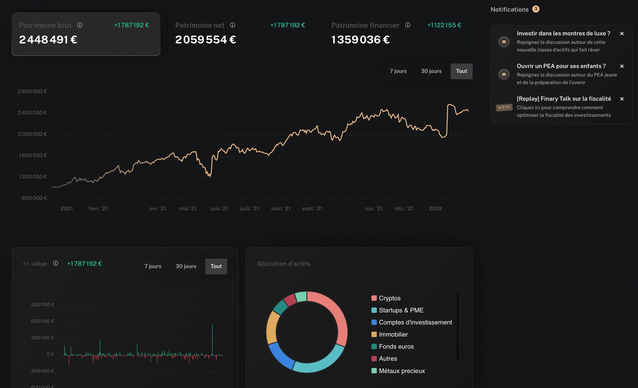 Finary est plateforme qui vous permet de faire l’inventaire de votre patrimoine financier. L’objectif est simple : regrouper en un seul endroit l’ensemble de vos actifs et passifs, synchronisés automatiquement, le tout dans une interface sobre et élégante.