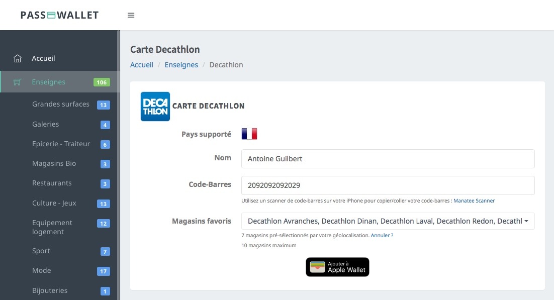 Malheureusement, très peu de magasins possèdent leur propre application sur l’App Store aujourd’hui. J’ai donc cherché un service permettant de créer des cartes de fidélité dans Wallet. Je suis tombé un peu par hasard sur le site PassWallet. Ce site vous permet de générer très simplement une petite tuile à ajouter dans Wallet.