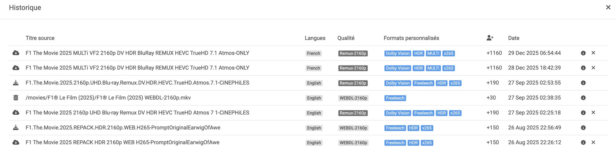26 août 2025 : Radarr trouve une première release en WEB-DL 2160p avec un score de +150 (HDR + Freeleech + x265). C’est en anglais uniquement. Le score est inférieur au minimum de 200 (mais se télécharge quand même car je n’avais pas mis de minimum à l’époque).