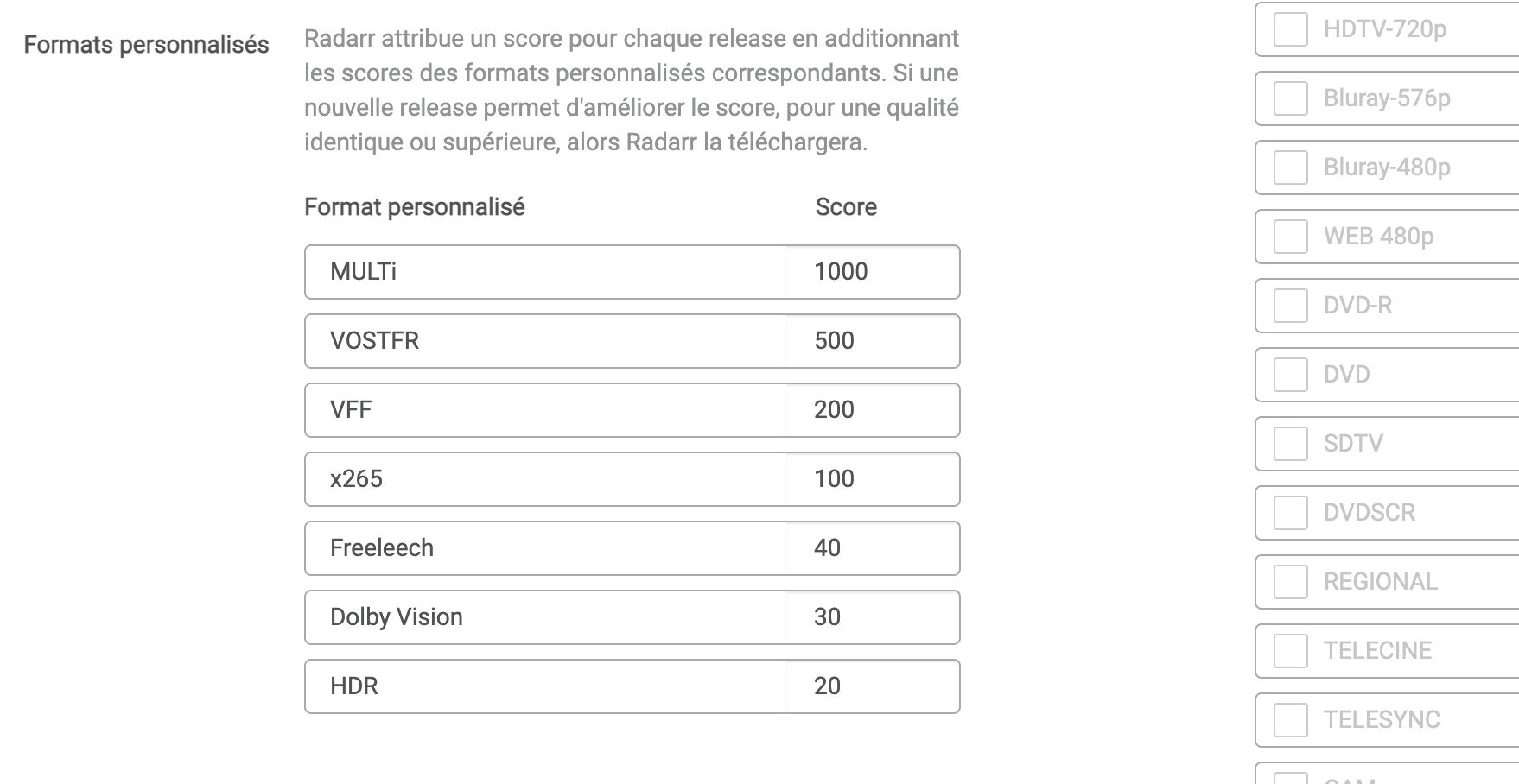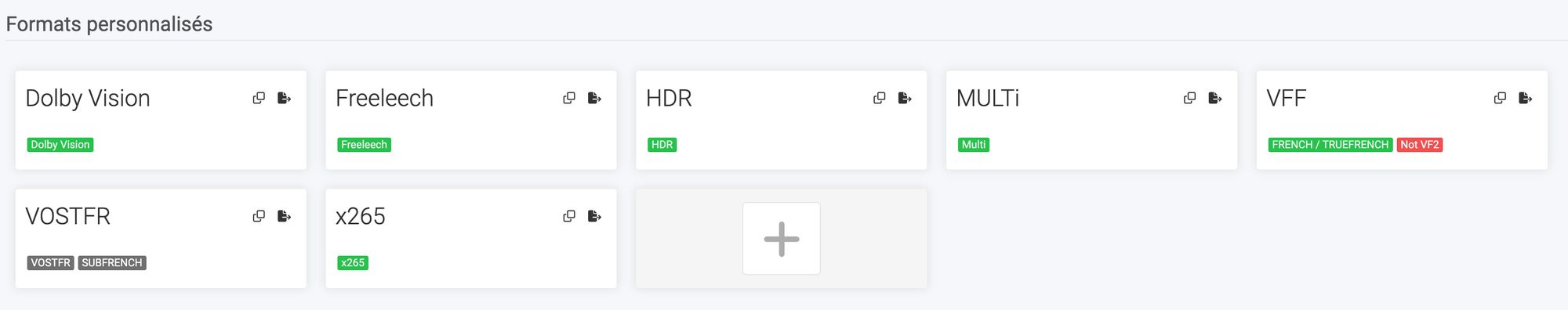 Pour les autres formats (x265, Freeleech, HDR, Dolby Vision), vous pouvez utiliser ceux proposés par défaut dans les guides TRaSH ou les créer vous-même avec les conditions appropriées.