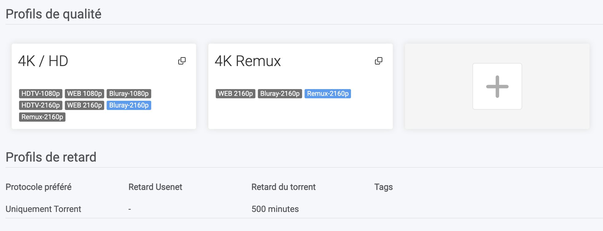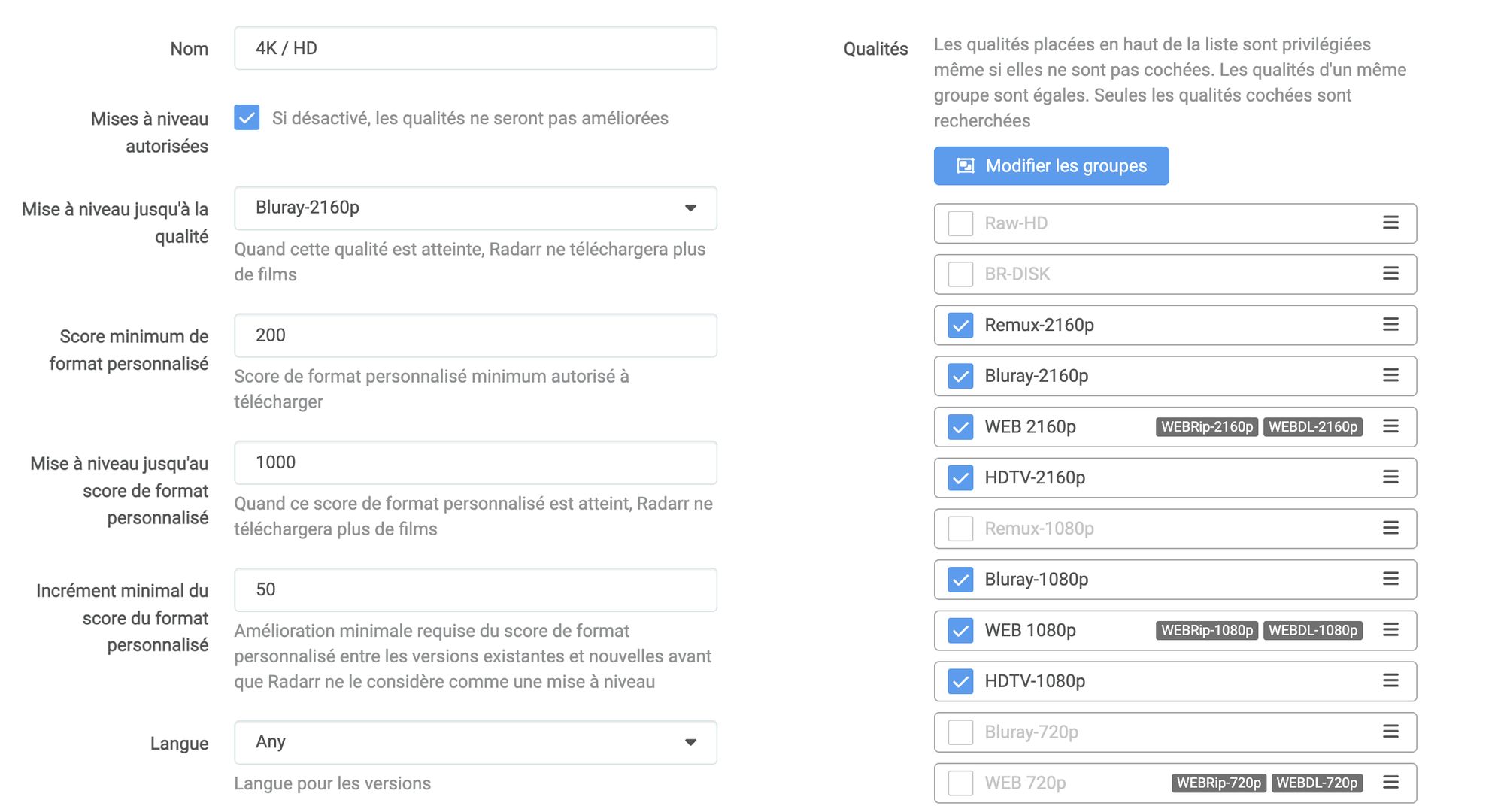 - 4K / HD : accepte les qualités de 1080p à 2160p (HDTV, WEB, Bluray, Remux). C’est mon profil principal, flexible pour avoir des films / séries assez rapidement.