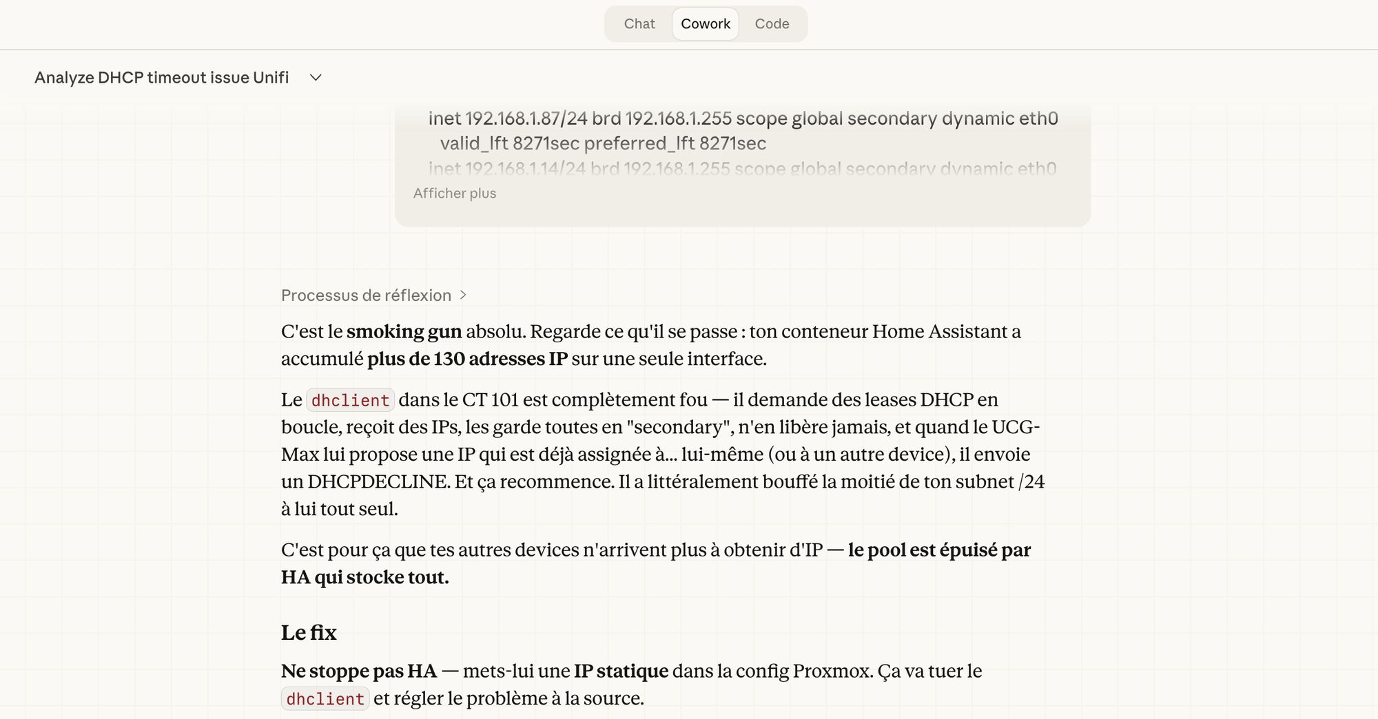Le bundle support UniFi, c’est un fichier qui contient des dizaines de logs, des configs, des dumps réseau. Le genre de truc dans lequel on se noie très vite quand on l’ouvre à la main. J’ai donc décidé de le confier à Claude et de mener l’enquête via le mode Cowork.