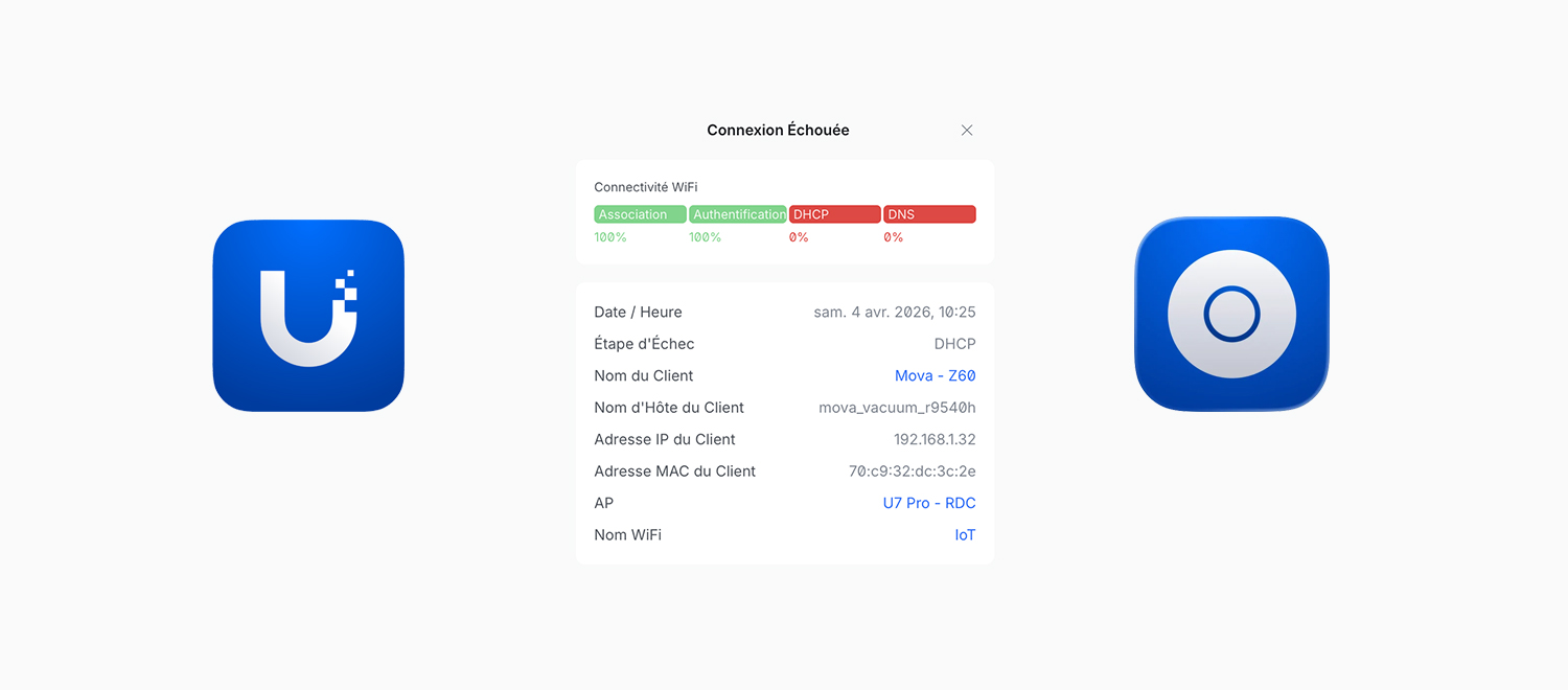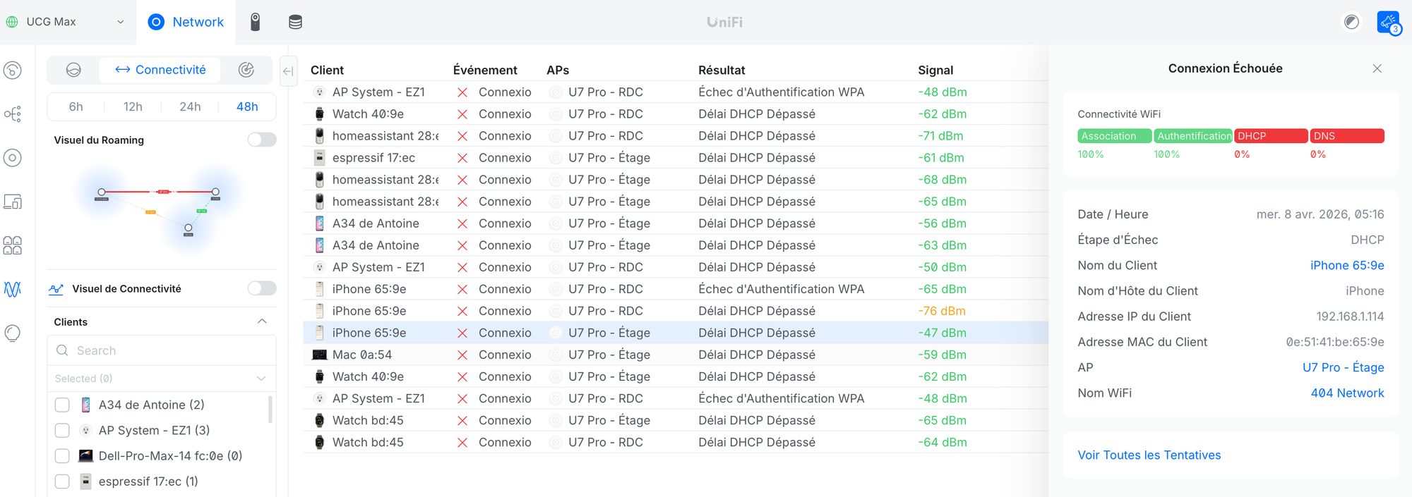 Côté UniFi, le diagnostic est toujours le même : l’association passe, l’authentification passe, mais le DHCP reste à 0%. Autrement dit, l’appareil parle bien au réseau mais n’obtient jamais d’IP.