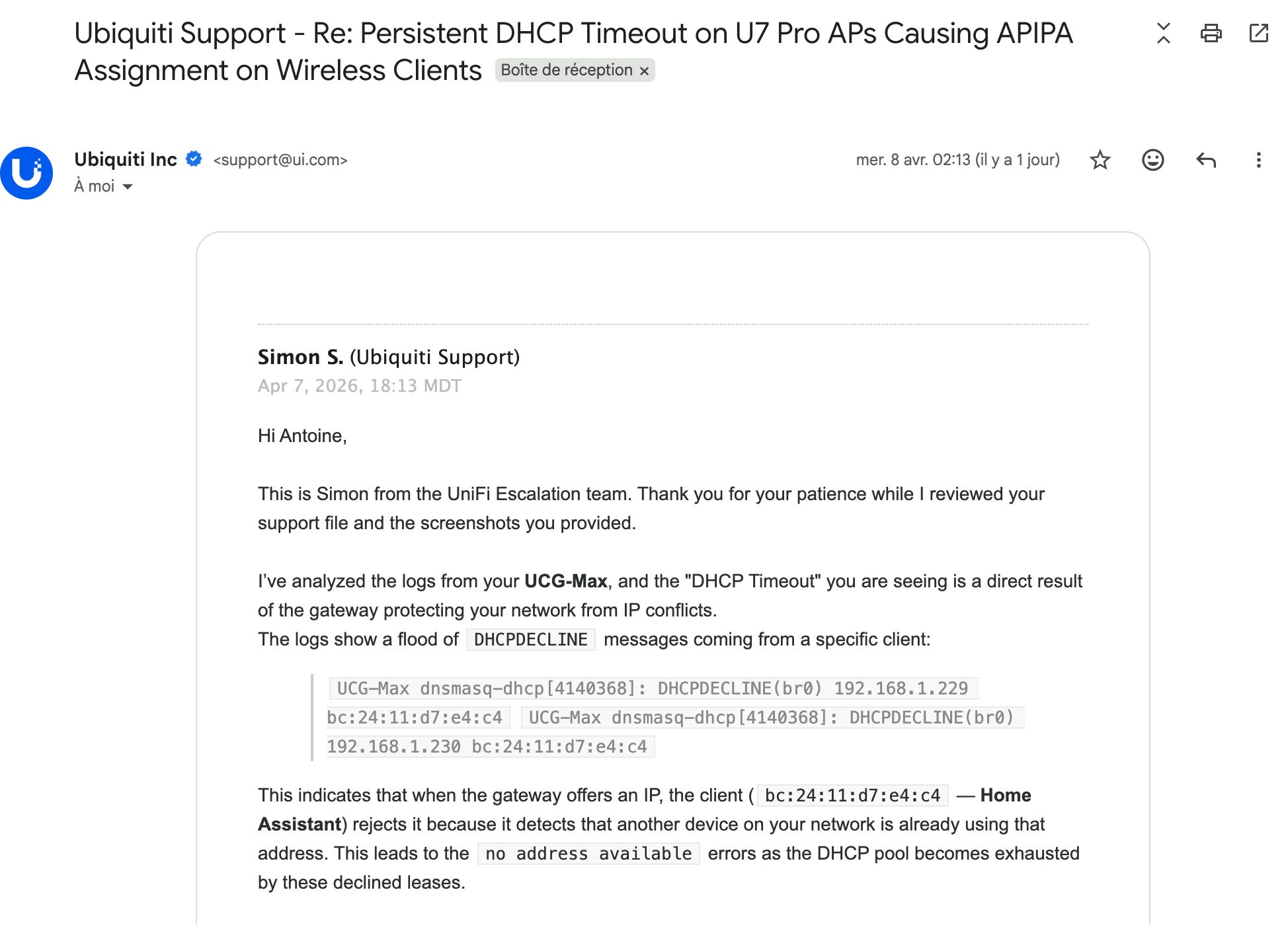 Après avoir fait le tour de mes pistes, je décide de me tourner vers le support UniFi. J’ai eu une réponse rapide (sous 48h) d’une personne qui a analysé les logs de mon UCG.