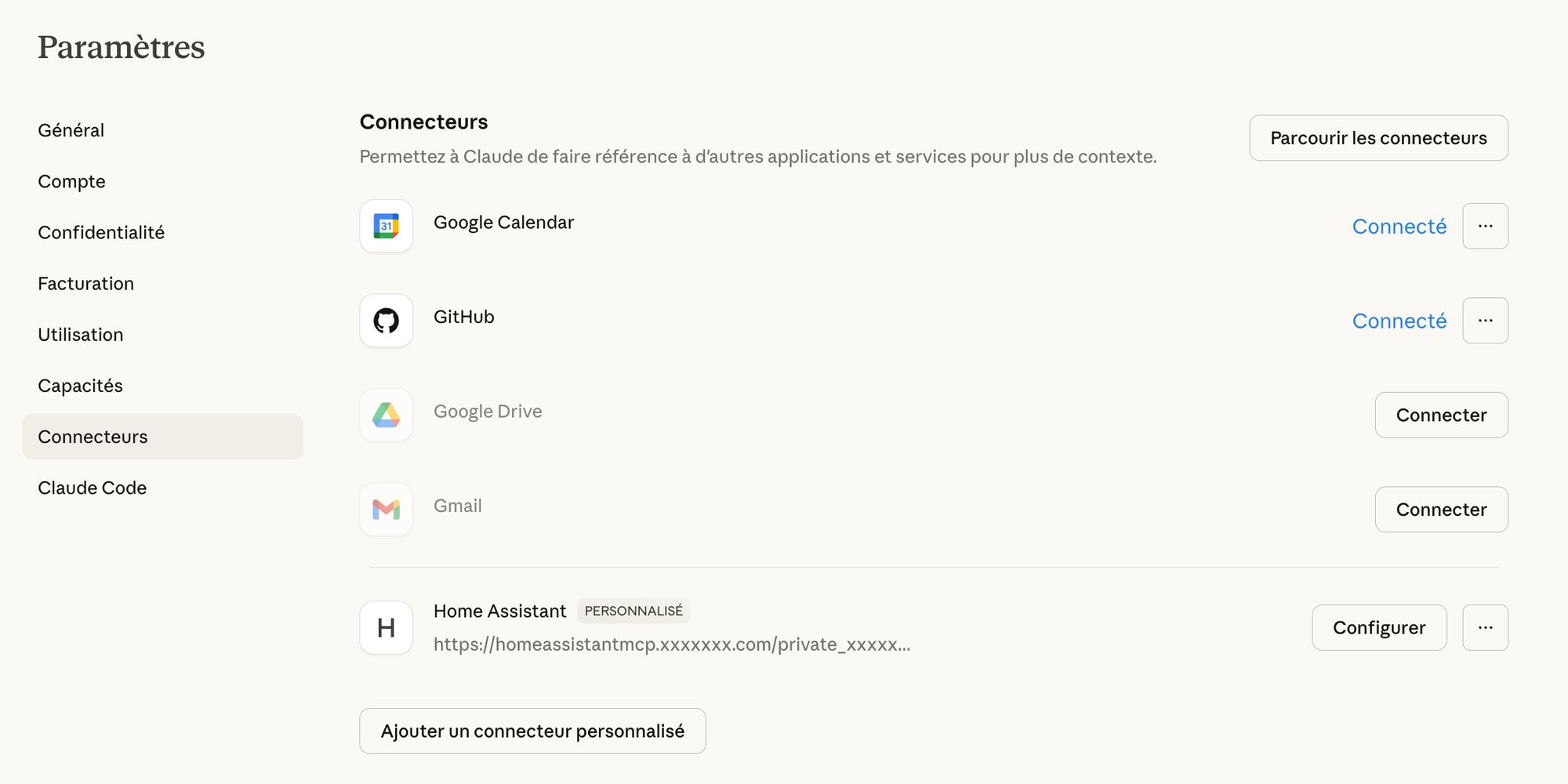 En quelques minutes, le serveur est opérationnel. Il ne reste plus qu’à configurer votre client IA (Claude, ChatGPT…) pour qu’il se connecte à l’URL du serveur. Dans mon cas, ça sera l’URL exposée par mon Nginx Proxy Manager suivi de mon MCP_SECRET_PATH.