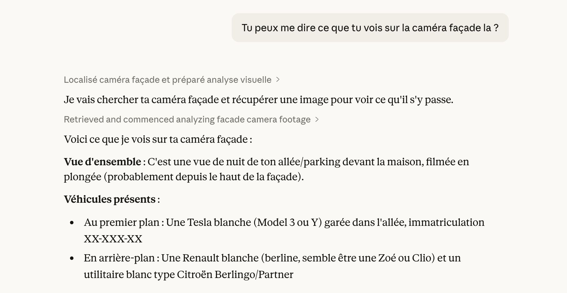 Analyser une caméra. Je peux demander à Claude ce qu’il voit sur ma caméra façade. Il récupère le snapshot, analyse l’image et me décrit la scène : véhicules présents, conditions, etc.