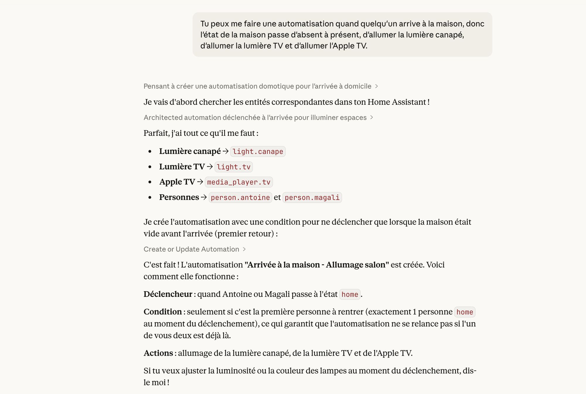 Voici quelques exemples de ce que j’ai pu faire avec HA MCP depuis que je l’ai installé.