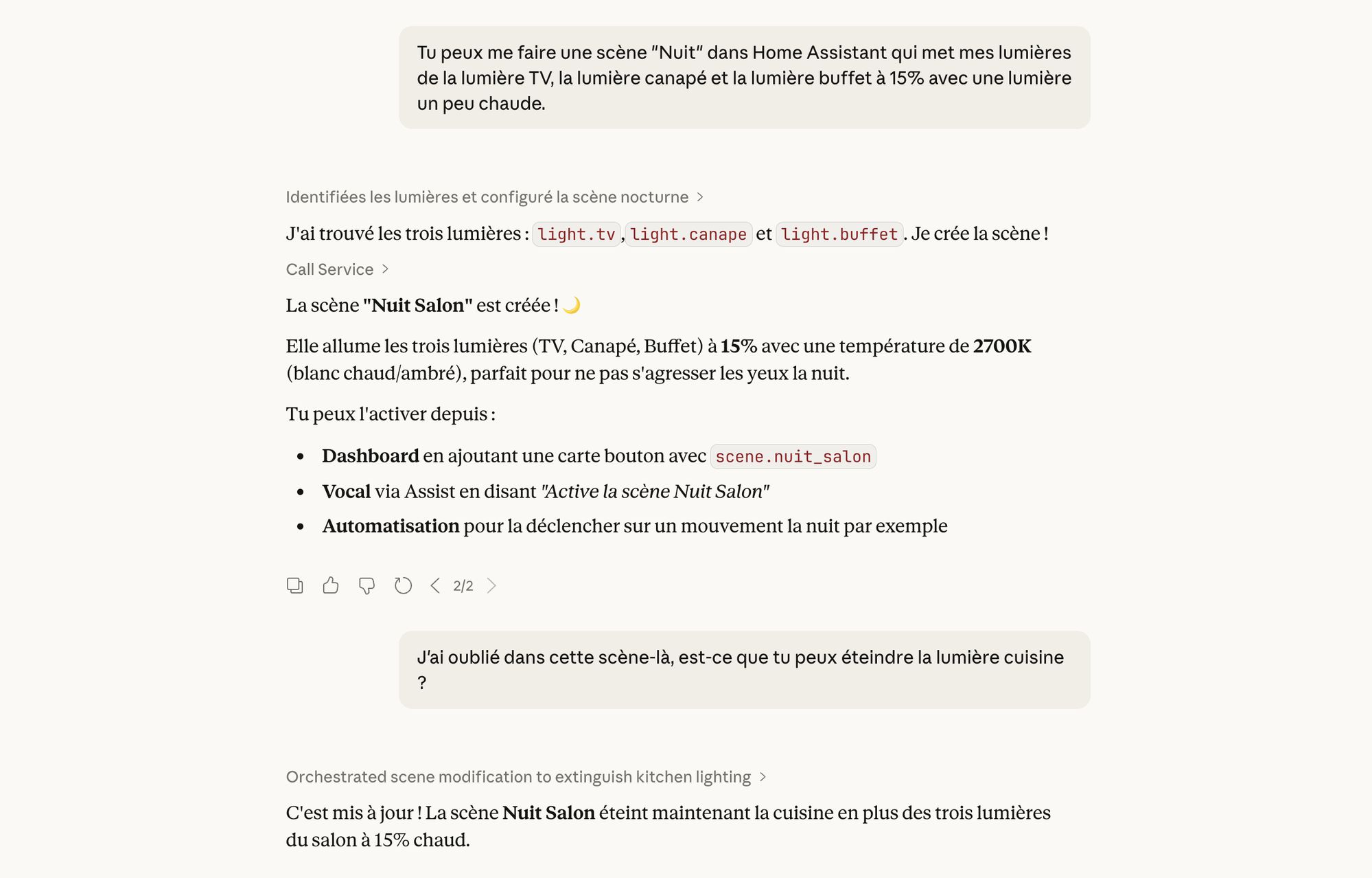 Créer une scène en une phrase. J’ai demandé : « Fais-moi une scène Nuit qui met mes lumières TV, canapé et buffet à 15% avec une lumière chaude ». Claude a trouvé les bonnes entités, créé la scène « Nuit Salon » à 2700K et l’a rendue disponible immédiatement dans Home Assistant.