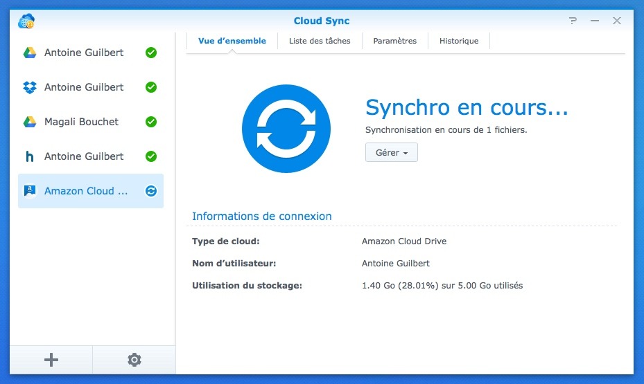 Pour sauvegarder tout ça en ligne, je me suis tourné vers mon NAS adoré de chez Synology. J’ai vu que Amazon Cloud Drive était disponible dans la liste des services fonctionnant avec Cloud Sync (présenté précédemment ici).