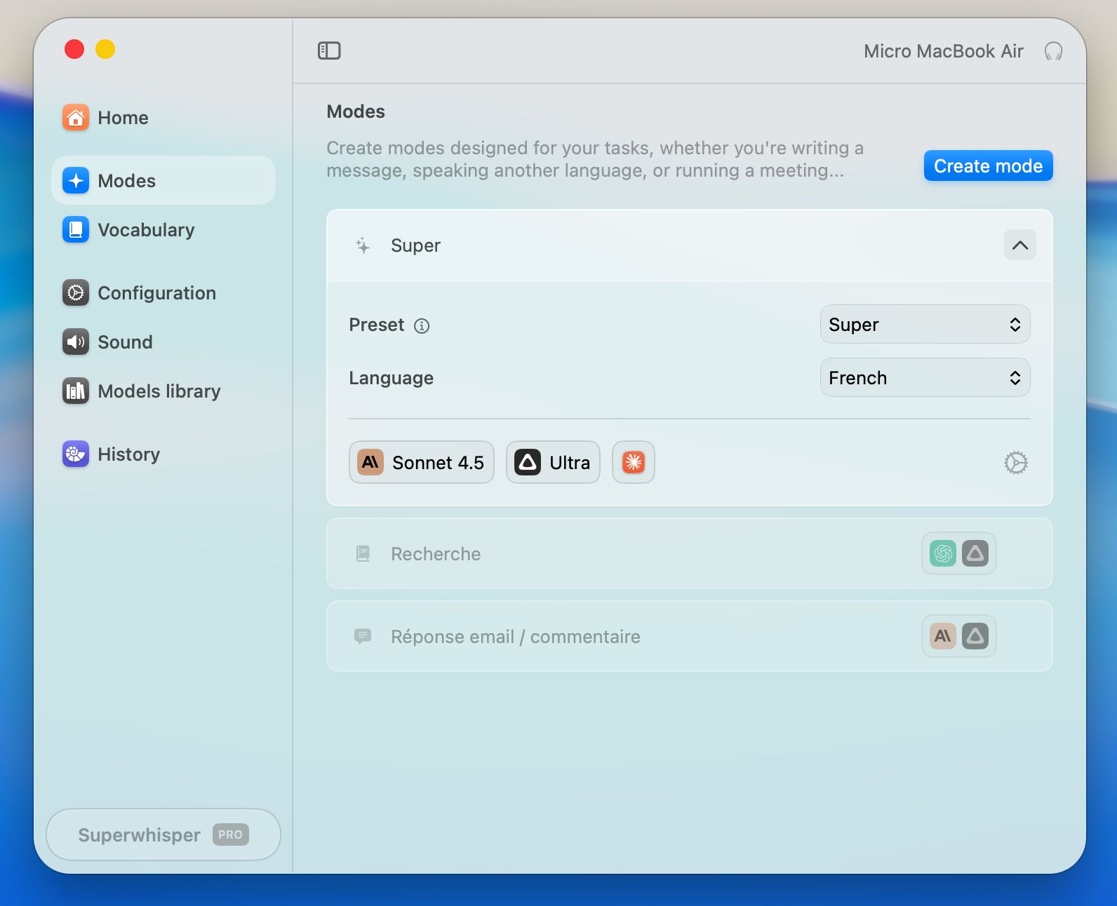 C’est vraiment là que Superwhisper se démarque. L’application propose plusieurs modes de fonctionnement qu’on peut personnaliser selon ses besoins, et surtout les associer à des applications spécifiques ou des sites web. J’utilise principalement trois modes.