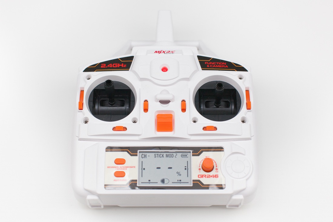 Intéressons-nous maintenant à la radiocommande pour contrôler le MJX X600. Comme vous pouvez le voir, elle fait assez cheap et ça donne plus l’impression d’être un jouet pour enfant que une télécommande pour piloter un drone. Je trouve cependant que la prise en main est plutôt correcte et le pilotage du drone est assez précis avec celle-ci.