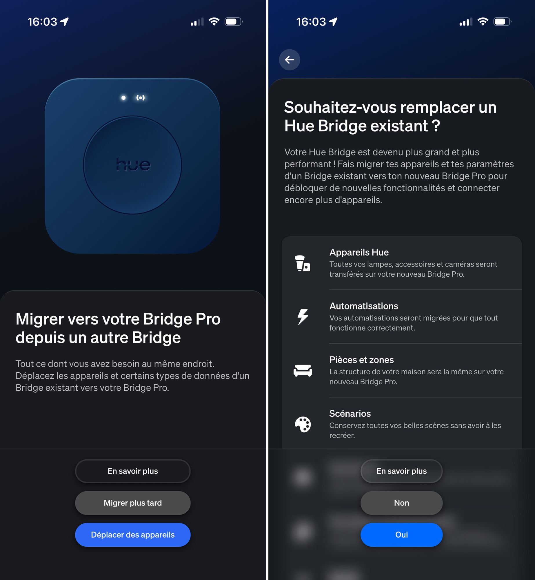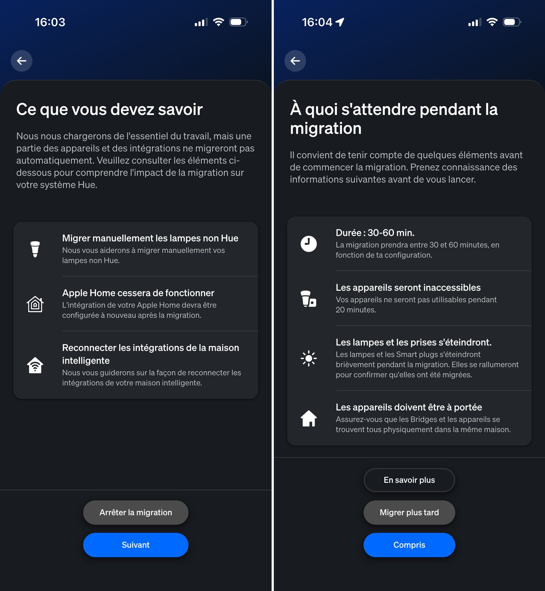 Philips recommande de prévoir entre 30 et 60 minutes selon la taille de votre installation. Dans mon cas, avec une trentaine de lampes, la migration automatique a pris 15-20 minutes, beaucoup plus rapide que prévu ! J’ai ensuite passé environ 20 minutes supplémentaires à reconnecter manuellement mes lampes IKEA et modules Sonoff.