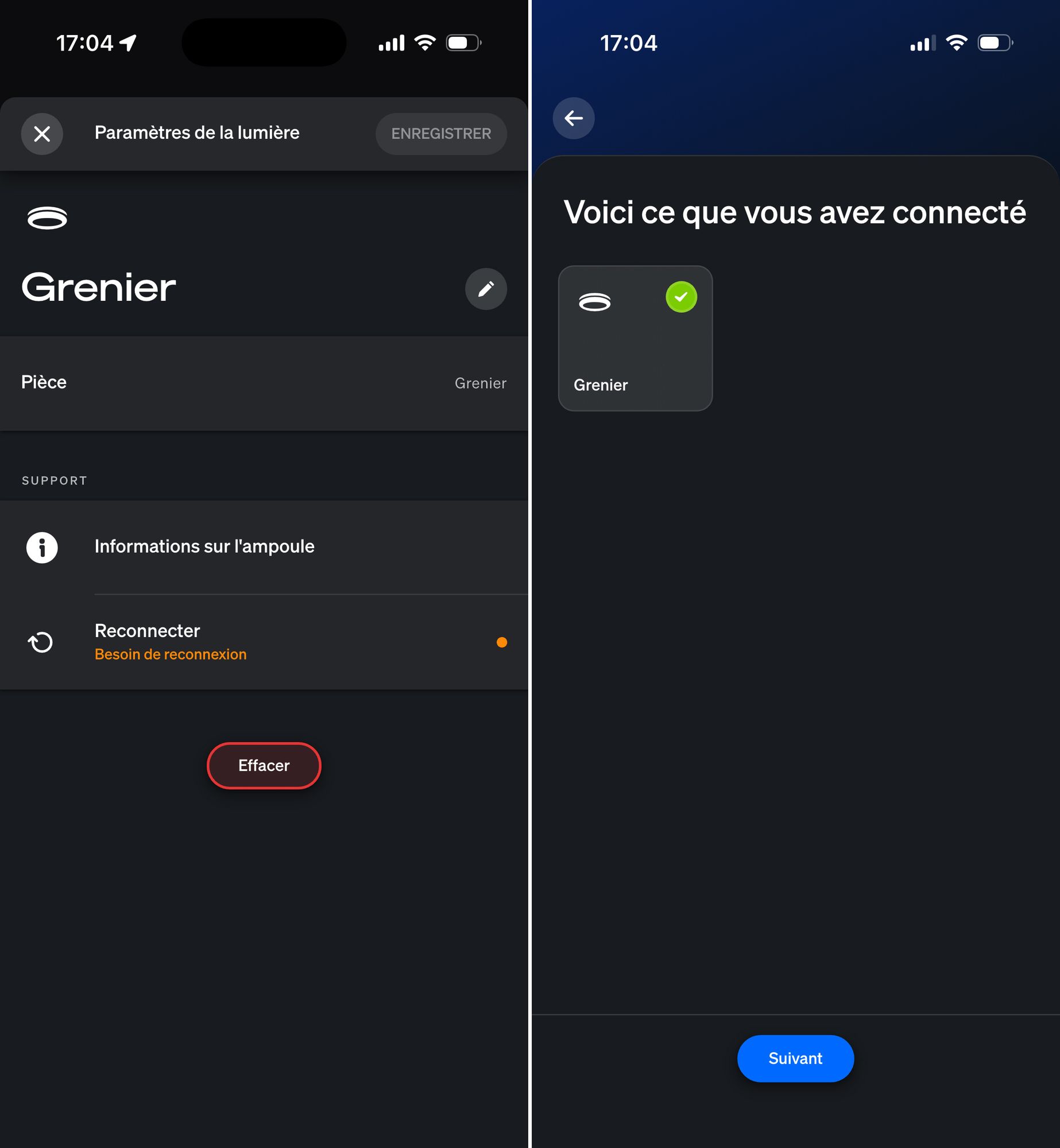 Dans l’application, il suffit d’aller sur l’ancienne lumière (qui apparaît comme « non disponible ») et de lancer la reconnexion. Ensuite, passez votre lampe IKEA ou votre module en mode appairage (selon les modèles, ça peut être un bouton à maintenir appuyé, un cycle d’allumage/extinction, etc.).