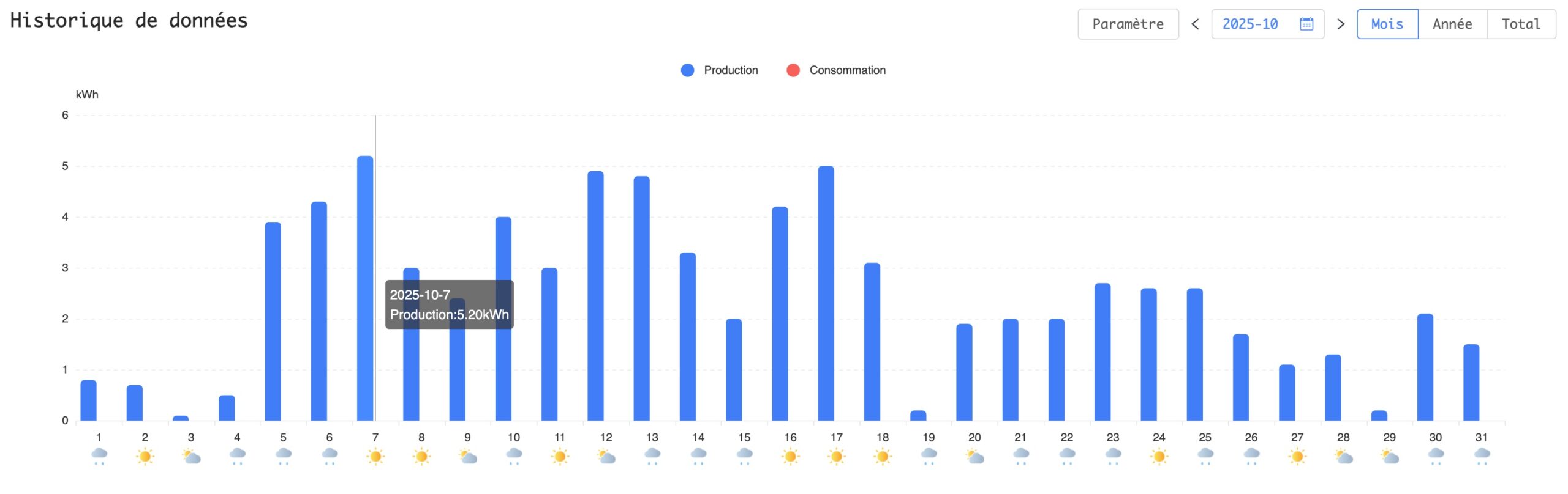 Le micro-onduleur étant connecté en Wi-Fi, toute la partie supervision passe par l’application SOLARMAN Smart, disponible sur iOS, Android et même via une interface web. L’app est plutôt bien faite : on y retrouve la puissance instantanée, la production journalière ou mensuelle, ainsi que le détail panneau par panneau. C’est suffisant pour suivre son installation au quotidien sans se prendre la tête.