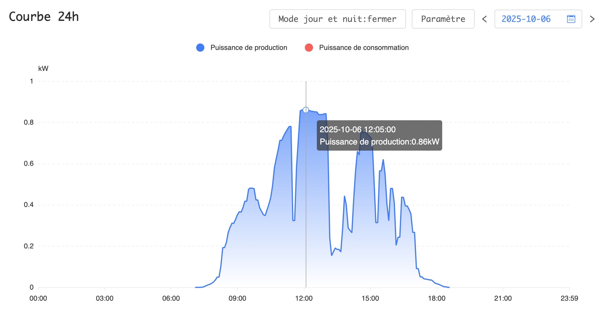 J’ai vraiment été bluffé par les performances de ce kit. Par rapport à mon installation Sunethic, j’ai constaté de meilleurs résultats, même si l’exposition est légèrement plus favorable ici. Avec deux panneaux totalisant 1040 Wc, j’ai atteint régulièrement des pics entre 860 et 900 W durant le mois d’octobre, ce qui est franchement excellent pour une période où le soleil est plus bas et moins présent.
