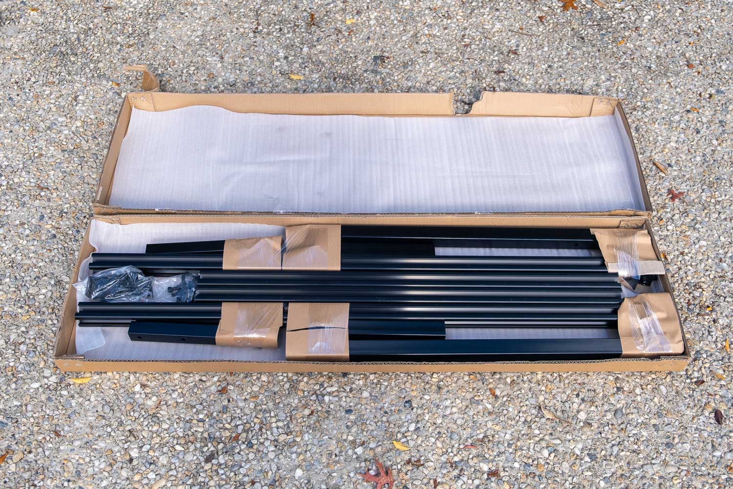 Contrairement au kit Sunethic que j’ai testé récemment, ici les supports ne sont pas préassemblés. Pas d’inquiétude pour autant : le montage est vraiment simple et tout s’emboîte proprement. Le kit est entièrement en aluminium noir, prépercé, et s’adapte aussi bien au sol qu’à une fixation murale.