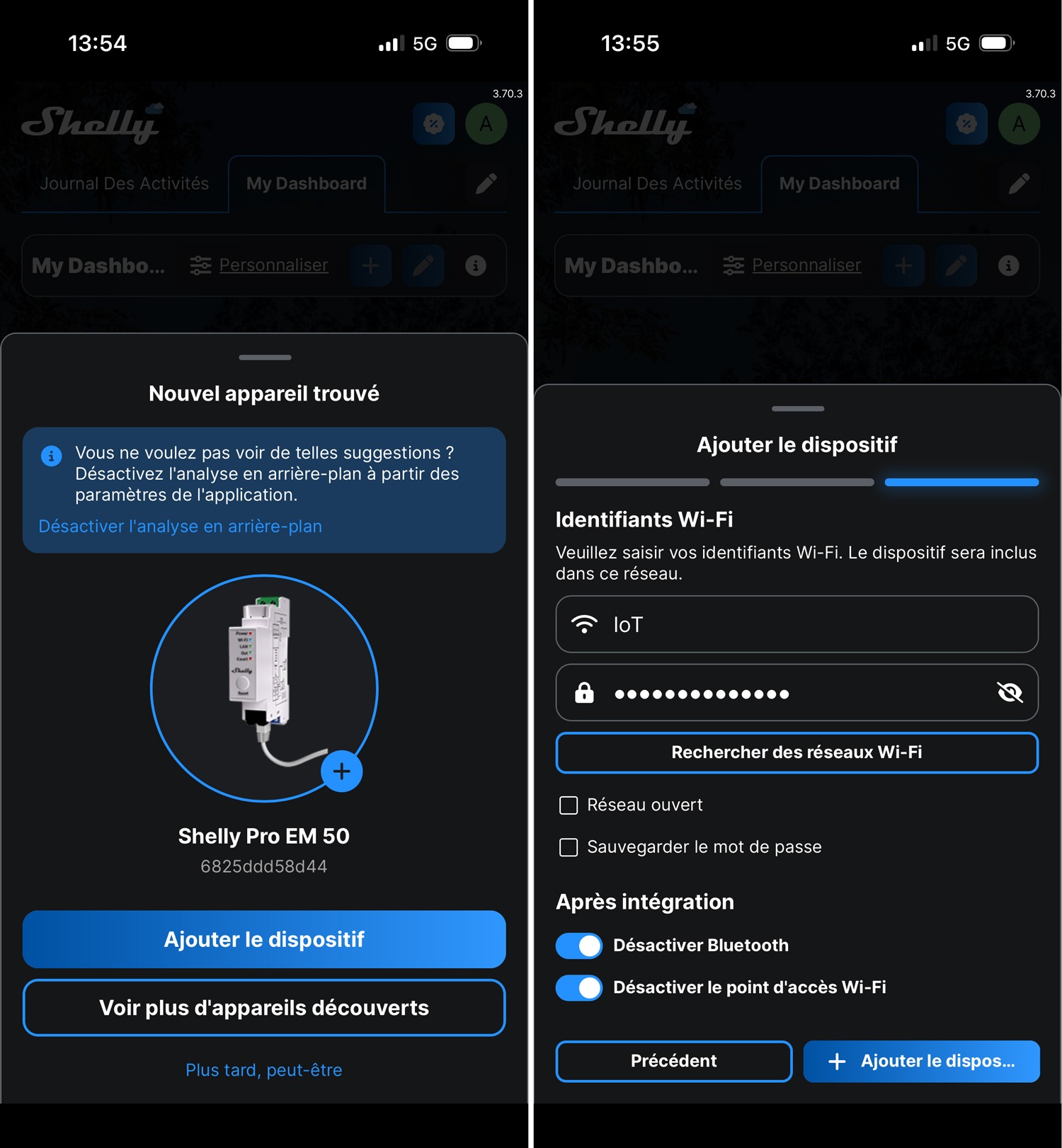 Une fois les pinces en place et le câblage terminé, vous pouvez refermer le tableau et remettre le courant. Le module Shelly va alors s’allumer et vous pourrez le connecter en Wi-Fi ou Ethernet. J’aurais bien aimé en Ethernet mais je n’avais pas de câble à dispo au niveau du tableau.