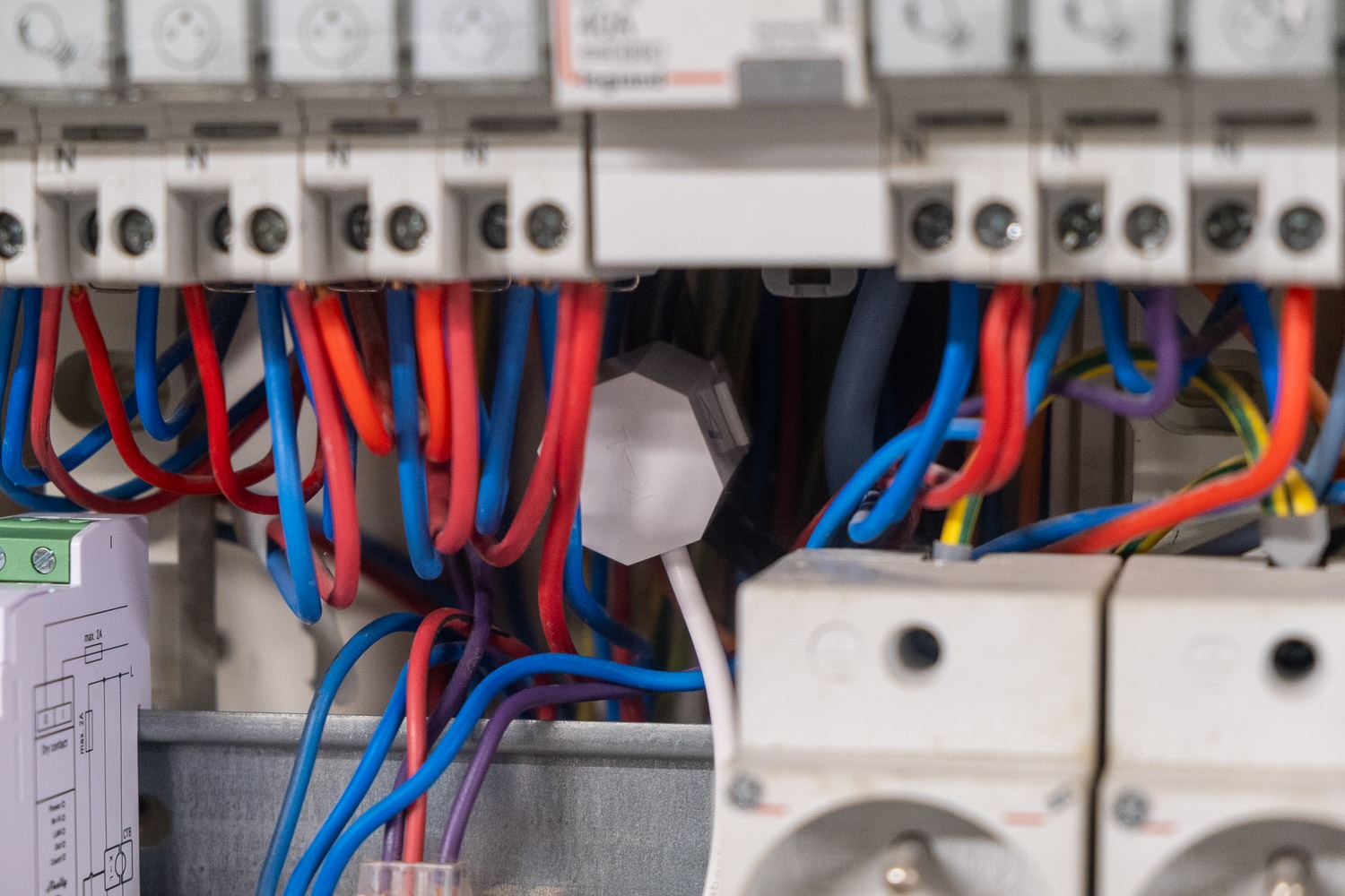 Tout d’abord, le Shelly a besoin d’une alimentation pour fonctionner. Le plus simple est souvent de se repiquer sur un disjoncteur existant de faible puissance, par exemple celui de la VMC (2 A). Cela permet d’alimenter le module sans ajouter un disjoncteur dédié, tout en restant conforme et propre dans le câblage. On le connectera sur les bornes N (neutre) et L (phase) en bas du module.