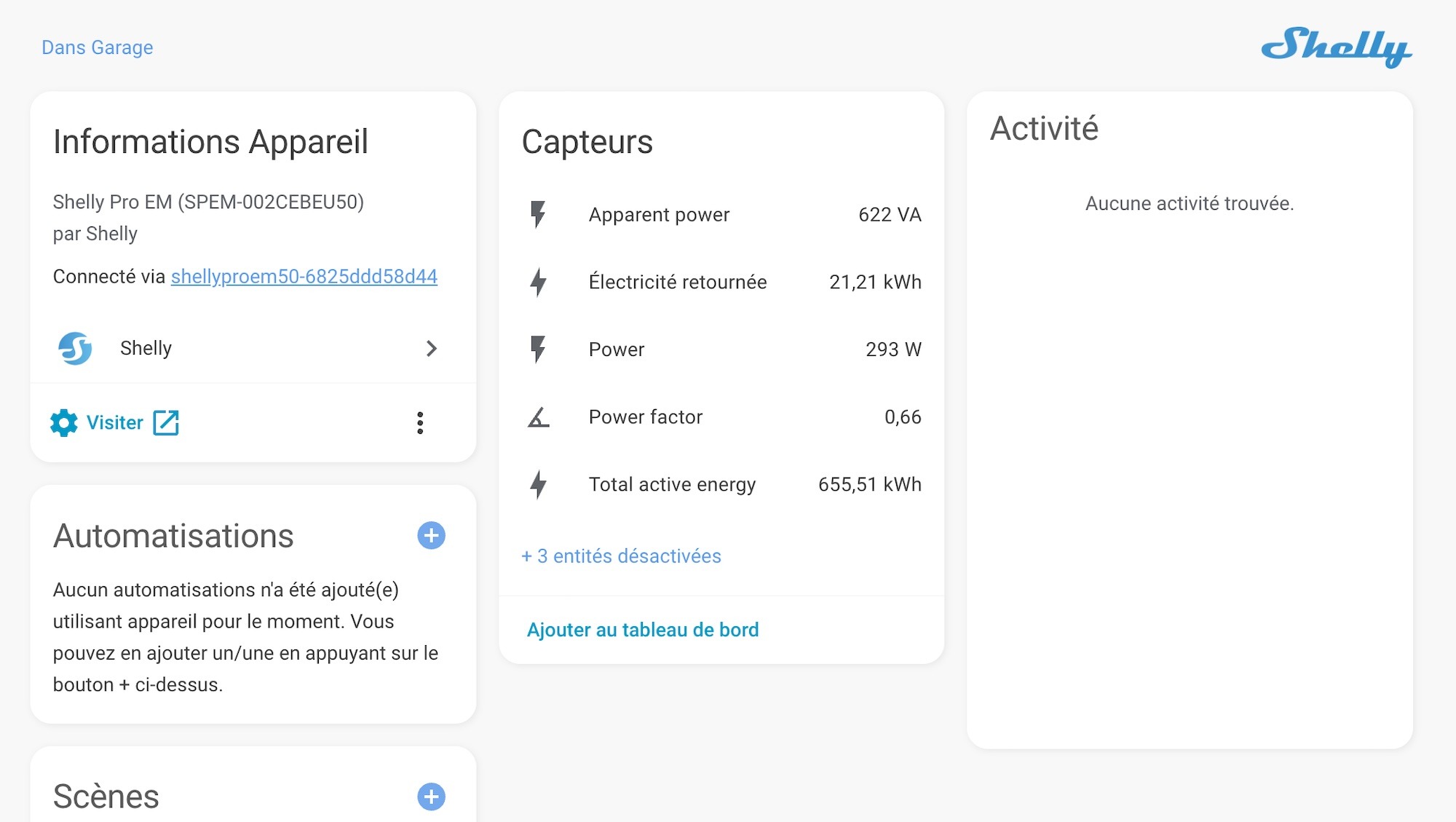 Dès que le module est connecté au réseau local, Home Assistant le détecte automatiquement, grâce à l’intégration native « Shelly ». Il suffit d’accepter la découverte et l’appareil apparaît aussitôt avec ses entités.