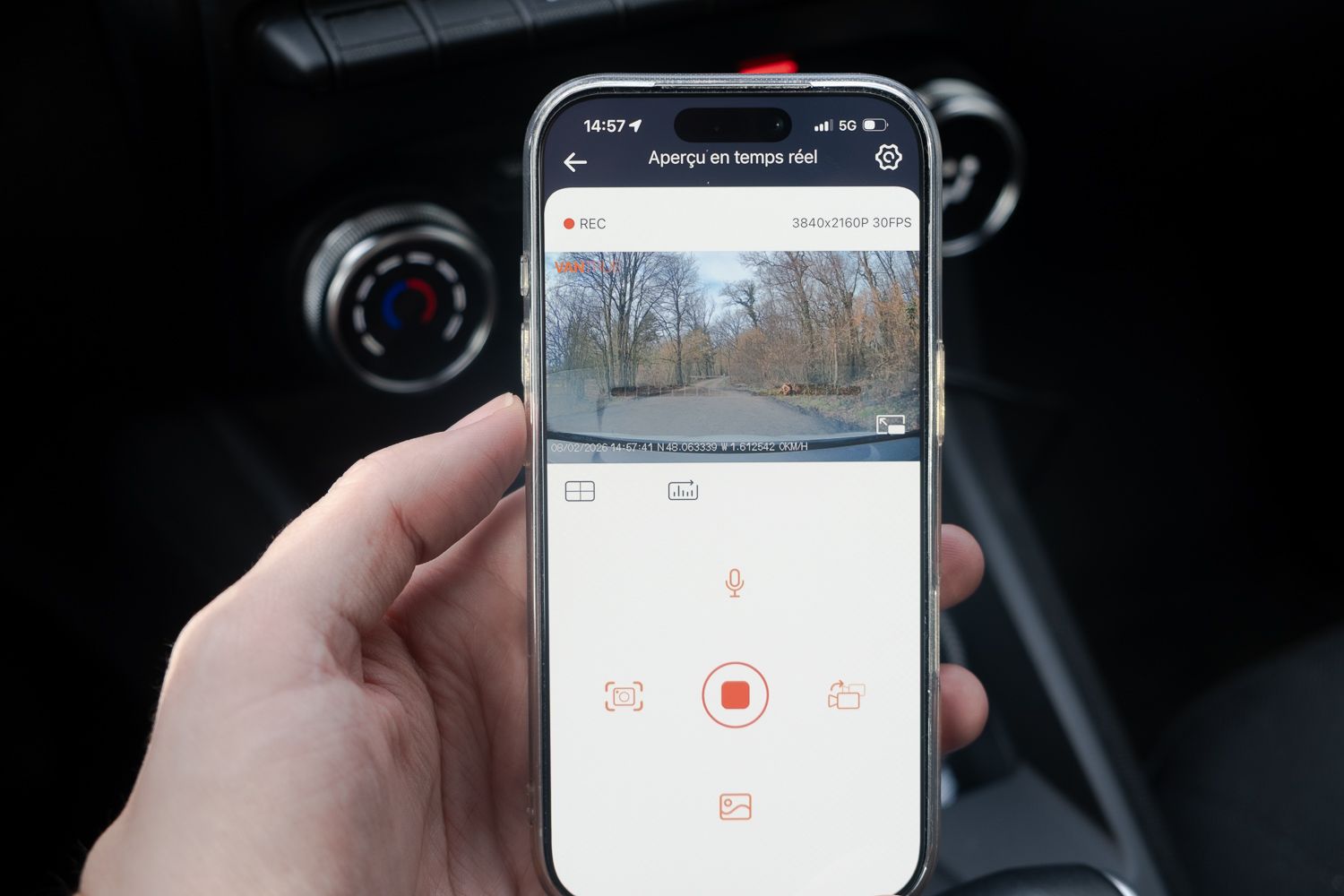 Les commandes vocales sont vraiment pratiques. On peut dire « Prends une photo » ou « Vidéo intérieure » pour piloter la dashcam à la voix sans quitter la route des yeux. Ça marche très bien et c’est beaucoup plus sûr que de manipuler l’écran en conduisant. Le seul petit bémol, c’est qu’il n’y a pas de mot-clé d’activation (comme « Hey Google » ou « Alexa »), du coup ça peut se lancer involontairement.