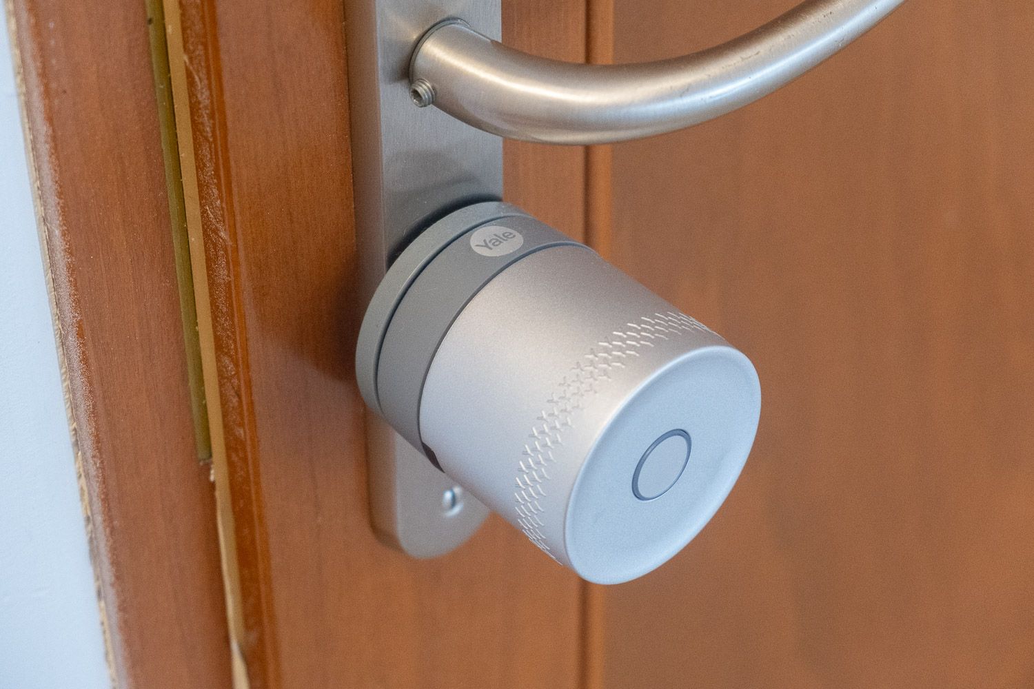 Concrètement, le principe est simple : on conserve sa clé physique dans le cylindre côté intérieur, et la serrure vient tourner cette clé de manière motorisée. Pas besoin de changer de cylindre si le vôtre dépasse d’au moins 3 mm côté intérieur, ce qui était mon cas avec une porte d’entrée assez standard. Si ce n’est pas le cas, Yale propose un cylindre ajustable vendu séparément à environ 44€.