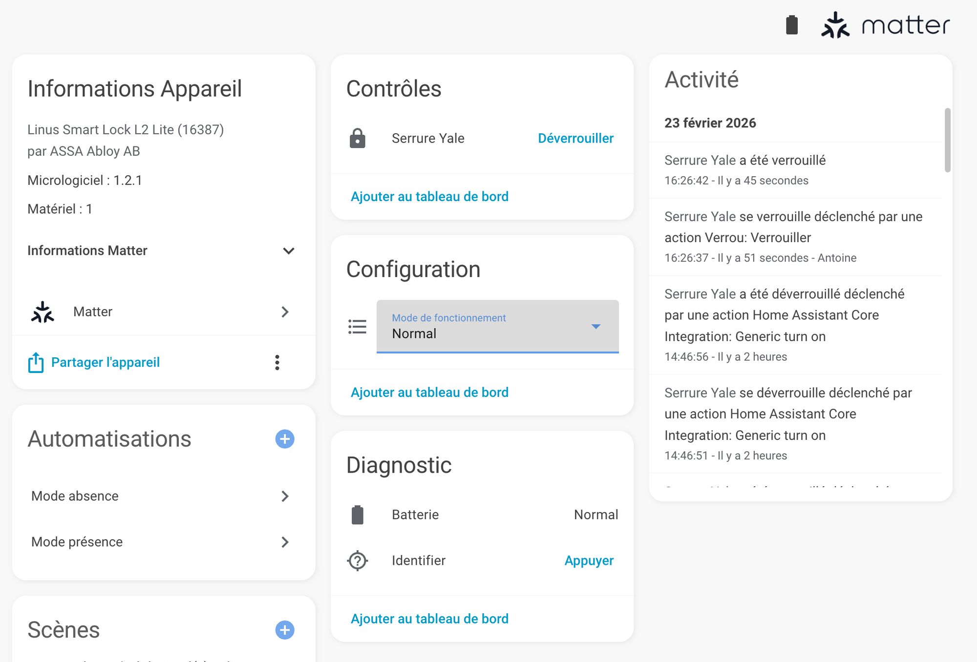 Dans Home Assistant, la serrure remonte les entités essentielles : état verrouillé/déverrouillé et niveau de batterie. Je l’ai intégrée dans mes automatisations existantes, notamment mon mode absence (la serrure se verrouille automatiquement quand je quitte le domicile) et mon mode présence (déverrouillage à l’approche). J’ai déjà détaillé ces automatisations dans un article dédié que je vous invite à relire !
