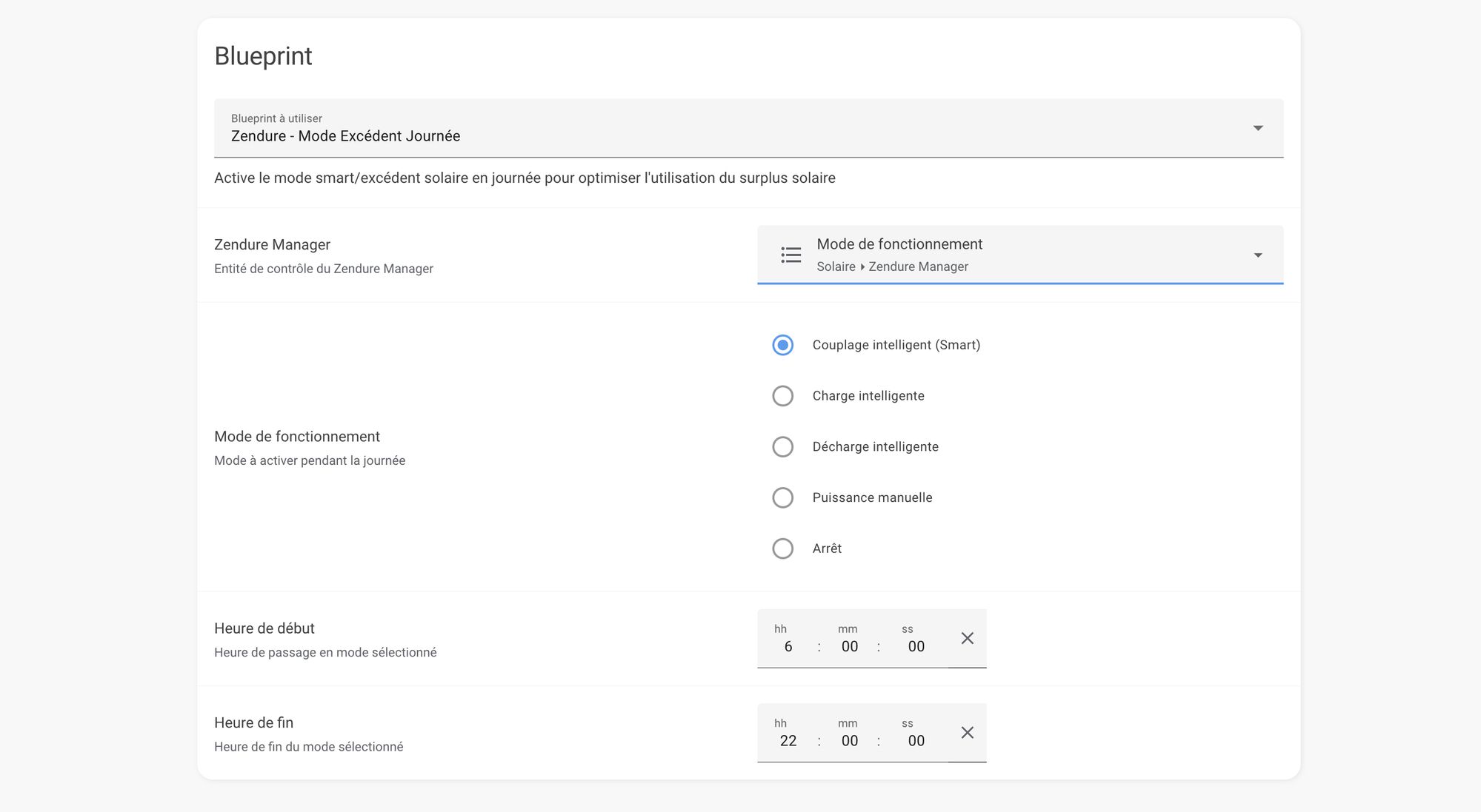 La seconde automatisation prend le relais à 6h du matin, à la fin de la période heures creuses. Elle bascule votre batterie Zendure en mode « Smart » qui correspond au mode excédent solaire.